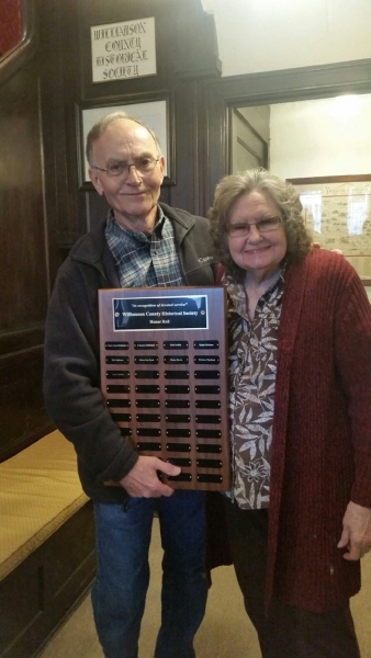The Williamson County Historical Society Honor Roll plaque was inscribed with a new name and presented to President Sam Lattuca by Helen Sutt Lind. Lattuca was cited for his dedication to improvements at the county museum building and his efforts to improve genealogical records available at the museum’s library and online over the last several years.