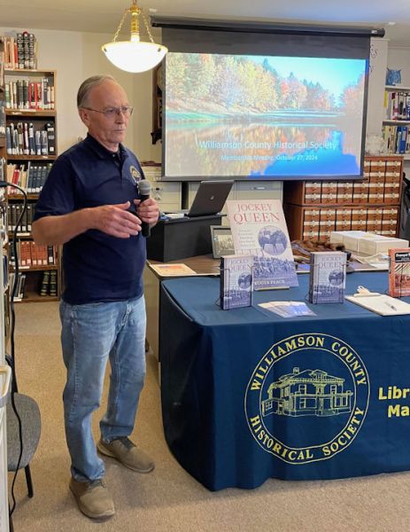 The guest speaker for the meeting was Roger Peach who spoke about his latest published book entitled “Jockey Queen”. The book was a biographical piece about a young woman named Lillian Jenkinson Holder who was born on a ranch in Nebraska in 1909. Lillian devoted her life to horse racing and the life of trying to be a female jockey in a male dominated occupation, often racing in Southern Illinois and particularly at the Williamson County Fair tracks and Duquoin Fair grounds.