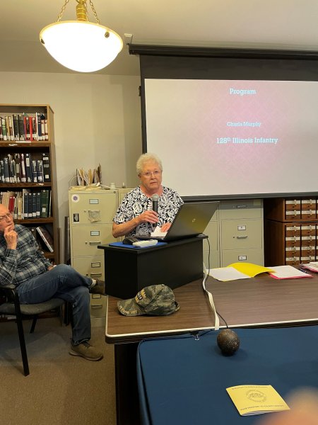 The program for the meeting was conducted by Marion resident and society member, Charla Murphy who gave a talk about the short lived 128th Illinois Infantry founded in the county not long after John A. Logan’s speech on the Marion public square in the fall of 1862 during the Civil War. The 128th has often been maligned through history and jokingly called the ‘wang dang doodles’ due to what appeared to be a mismanaged and highly disorganized unit with a high desertion count. Murphy, however, through reading newspapers of the time, government reports, regimental records and pension reports made the case that there was another far more complicated side to the story that involved potential sabotage by confederate sympathizers, failure of leadership and political intrigue.