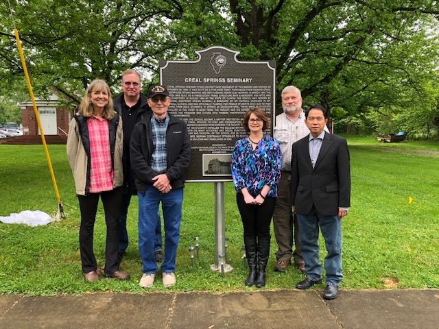 The weather cleared up just long enough for over forty people to attend the dedication of an historical marker dedicated to Creal Springs College on Saturday, May 11th , 2019 at 2 P.M. The marker was dedicated at 206 Line Street in Creal Springs which is now property owned by the Methodist Church of Creal Springs.