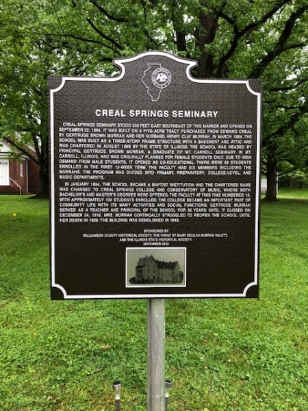The marker is dedicated to the Creal Springs College and Seminary. The college was built on a 5 acre tract purchased from Edward Creal by Gertrude Brown Murrah and her husband Henry Clay Murrah in March 1884. The school was built as a three-story frame building with a basement and attic and was chartered in August 1888 by the State of Illinois.