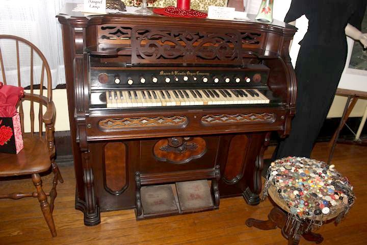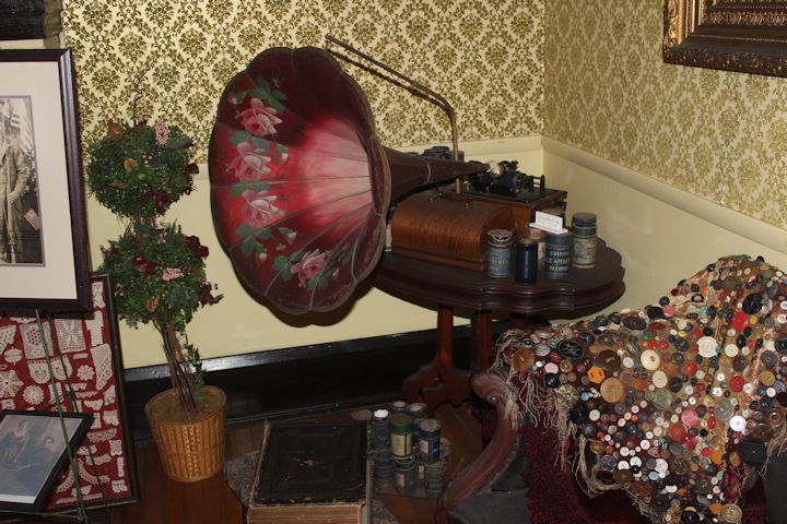 The parlor also contains a Black Horsehair Sofa that looks just like the one in the home of Abraham Lincoln in Springfield. We believe ours to be of the same era, circa 1850. And what would a parlor be without entertainment. On display is a numbered Mason Hamlin Organ made in France in 1874, formerly used in the Carbondale Lutheran Church and an Edison Phonograph with Morning Glory Horn that was donated by Paul Gore. There are several cylinders which still play, though scratchy.