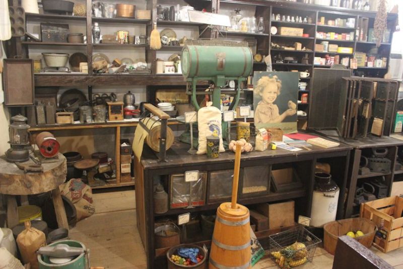 We have a display of household and kitchen items like old washing appliances and tools, cooking and baking tools, ice boxes, irons, stoves, a portable pantry, weaving looms and much, much more.